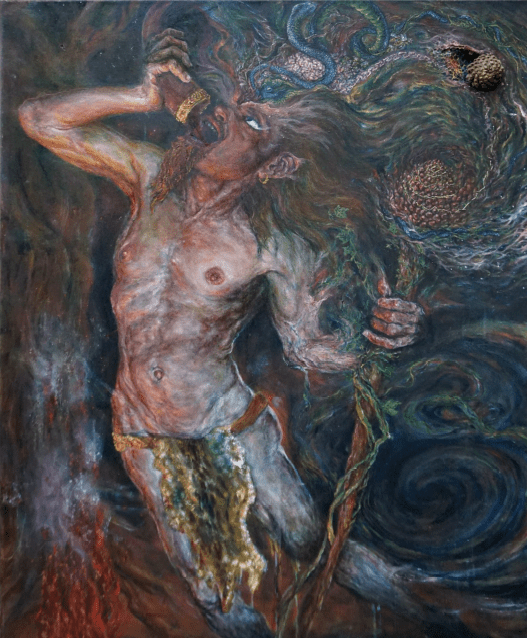 ‘The Ancient Thracian (later Greek) God of Drama, Ecstasy and Intoxication ‘splits open his head’ to reveal fantastic worlds within, the dreaming inherent in (and out of) our minds.The golden thread woven through the canvas represents a gift from his consort Ariadne, who abandoned Theseus for Him after helping that hero out of the Minotaur’s Labyrinth. I figure Dionysos needs this solar thread of reason even more, so he can find his way back from madness and ecstasy of exploring the unfathomable contents of His own psyche and worlds of dreaming intensity.”