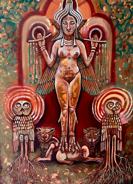 ‘Originally I painted this for my own temple space; I wanted to recreate the Inanna/Ishtar burnley relief as a personality & ceremonial power totem. So I used my moon blood as the red letter of Lore to express her rich red tones, and copper leaf for the background glow. The totemic animals were painted with my hands in hand-collected Australian ochres, for a raw feel and to venerate her Earthly connection’.