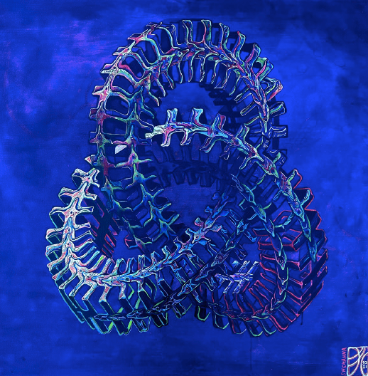 ‘Trinary Code is a dedication to the brilliant and inspiring MC Escher, who has influenced my entire art journey. …Trinary code is a flexible exo skeleton of bio-intelligent life forms that assemble and disassemble according to the needs of their purpose, in this case as a möbius strip. They are fluid, yet a structured plasmic substance that responds to programmable codes.’