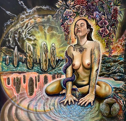 In Melissa’s own words, she proudly states that her work is deeply rooted in the totemic lineage of the Honeybee Dreaming Priestess. She sees herself as an oracular embodiment, a vessel through which esoteric knowledge is channeled and passed on as sacred ritual. Each of her canvases serves as a visionary portal, inviting viewers into a realm where the mysterious and profound intersect. Through her art, Melissa engages in a potent magical rite, weaving together symbolism, spirituality, and artistic expression.