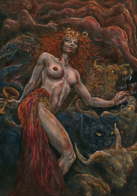 One of the major accomplishments of the occultist Aleister Crowley is, I think, his restoration of the female goddess to power and prominence in the pantheon. Babalon (also known as the Scarlet Woman, Great Mother or Mother of Abominations) is a deity found in the occult system of Thelema, which was established in 1904 with the writing of Crowley’s The Book of the Law. In his Aleister Crowley Manual, author and occultist Marco Visconti says that the name Babalon first appears to John Dee as an Enochian word meaning wicked harlot. But for Crowley, the figure is akin to Shakti the secret power underlying all of creation and residing within ourselves. She is considered a sacred harlot because she denies no one yet she extracts a great price: the ego identity. As Visconti says, ‘Babalon is a multifaceted and incredibly complex egregor that divide defies every attempt to pigeonhole her’. He cautions that it is problematic to cast her solely as a feminist icon: although she does embody that role, she is a vector of transcendence. You do not have to be a Thelemite (I am not) to find Babalon exciting and challenging: She stands for the radical acceptance of everything and its transcendence.