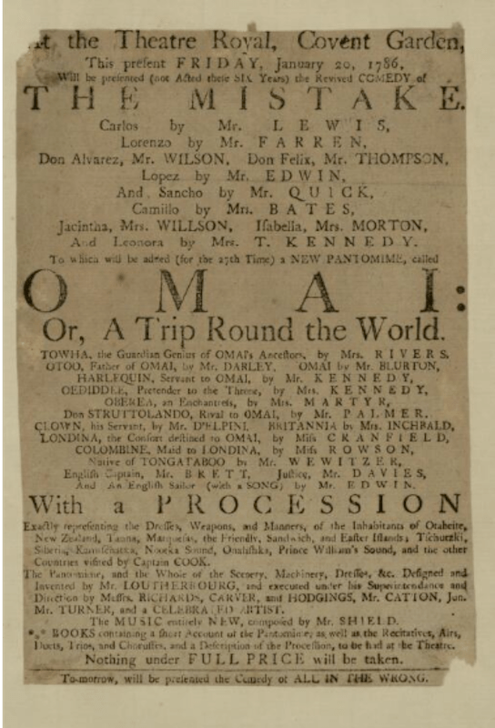 For the 1785 theatrical masterpiece, Omai: A Trip Around the World, Loutherbourg crafted a celestial apotheosis of Captain Cook. The play narrated the true story of Omai, a Polynesian prince brought to England by Captain Cook. Loutherbourg’s stage effects included South Sea Islander sorcerers, ghosts, and a ‘guardian spirit’ who appeared in a blaze of liquid fire at the play’s climax. In a patriotic tableau, Captain Cook ascends to heaven, accompanied by Britannia. This scene may have been influenced by symbolic rebirth conceptions derived from Loutherbourg’s involvement in Freemasonry. Notably, the martyred captain’s ascension featured him carrying a sextant – which resembled a masonic compass. (Kleber Monod)