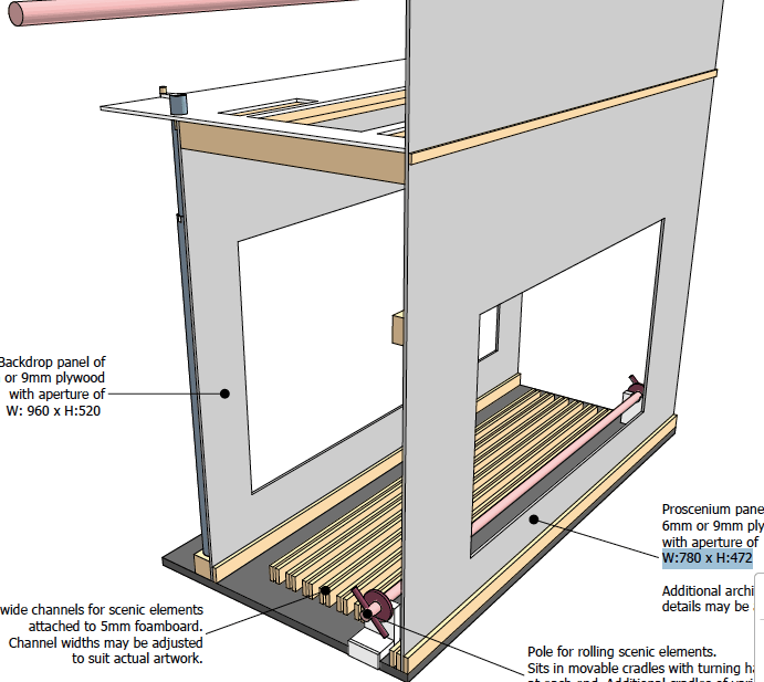 Fortunately, I was able to contact Robert Poulter and, in addition to organising an event including one of his incredible performances, I am able to benefit from his knowledge and assistance on establishing my own Eidophusikon. Robert wrote a book called How to Make Your Own Model Theatre, which we utilised as a framework. Collaborating with Mark Fairhurst of Bosco Design, we developed – and Mark built – a functional Eidophusikon in the following dimensions: