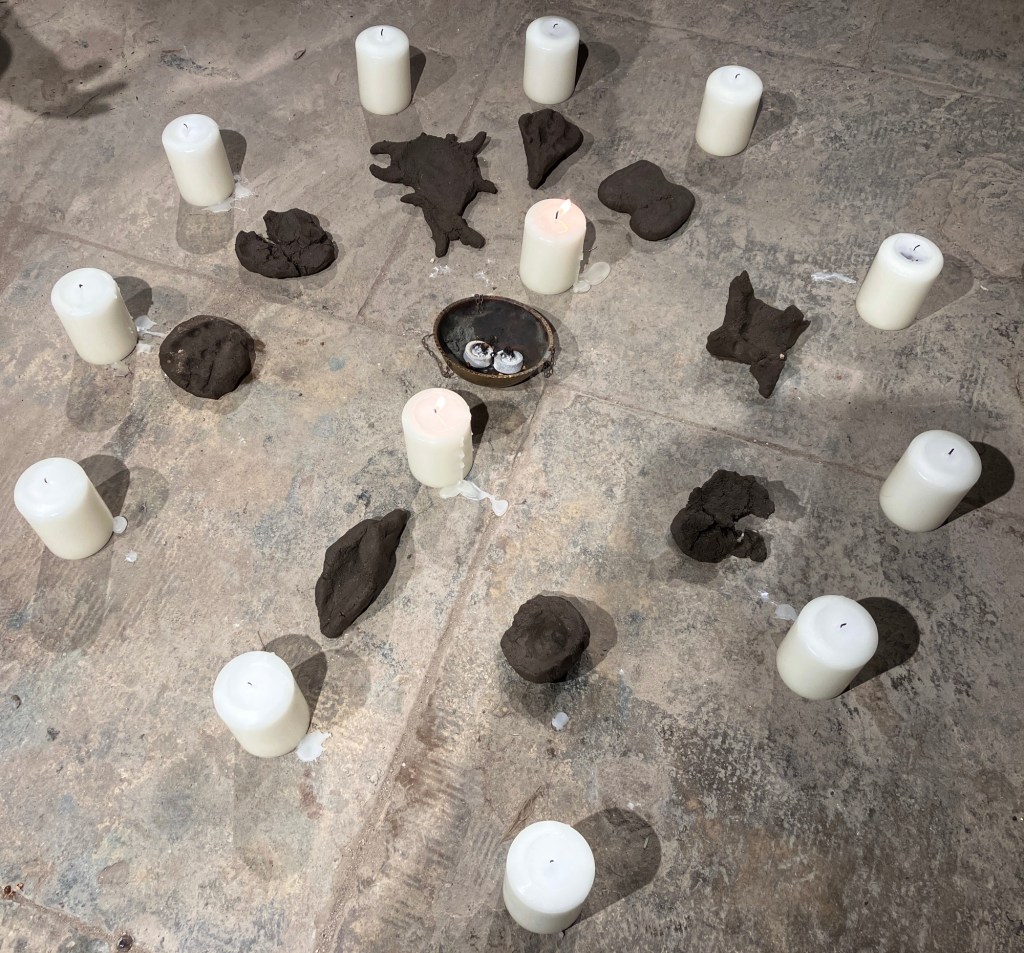 I realised that I had not touched real clay since junior high school which was the only time I ever did any ceramic work I have tried air dry clay, but that doesn’t really have a very nice feeling texture. This clay was cool as I pressed it between my hands. It just felt so wonderful. It felt like I’ve been waiting for this but I didn’t know it. I really enjoyed the feeling of the clay as I very gently manipulated it between my hands. Geraldine asked us to make an object -keeping our eyes closed- an object that we could use as a votive offering in memory of the women who had been caught up in the witch hunts and been sacrificed. I felt myself slowly shaping a kind of bowl, just a small cup in the hollow of my hand. I took such pleasure in shaping it, feeling the clay, feeling it warm under my hand, imagining the imprint of the lines of my palm on the clay, the imprint of my fingertips The wholly unique pattern on my hand and finger. Eventually she asked us to place our offering object into the circle of candles.